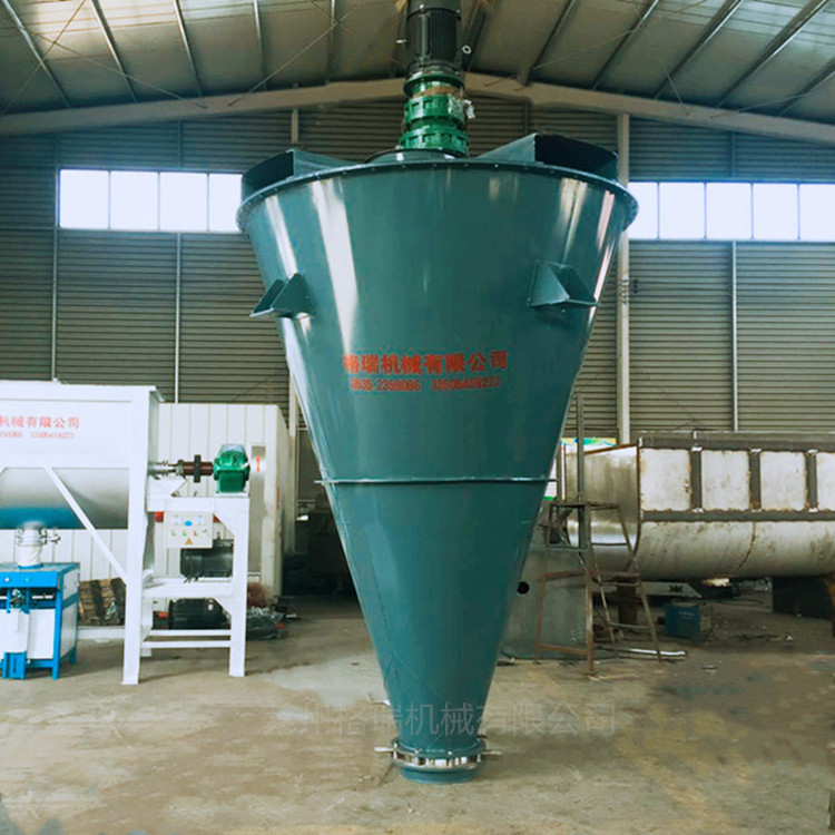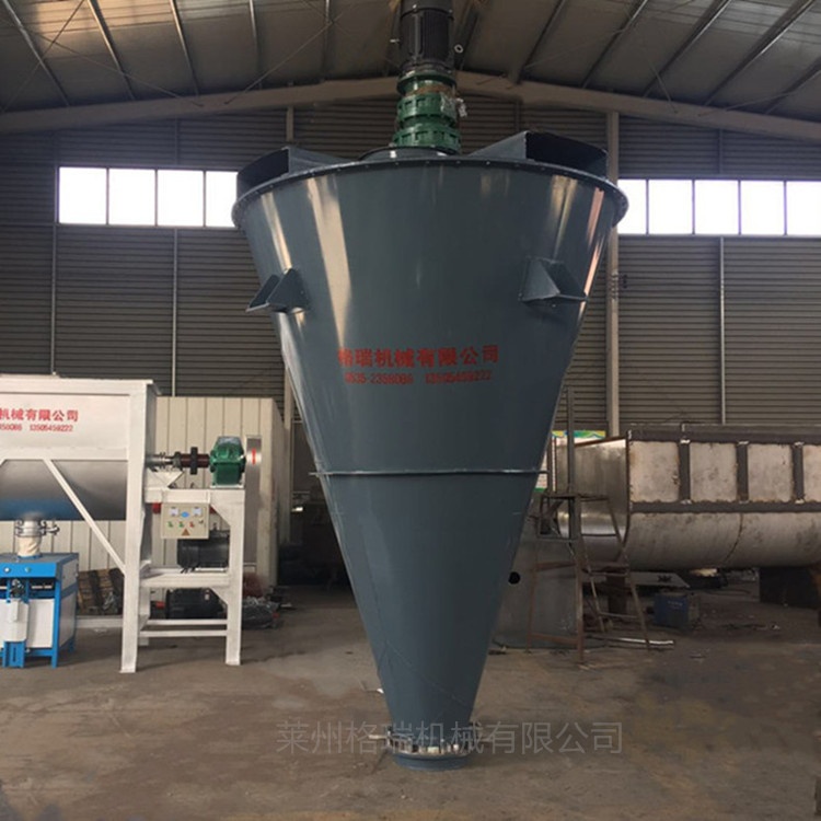 雙錐混合機由噴液裝置、傳動部分、筒蓋、螺旋、筒體、出料閥等部件組成。