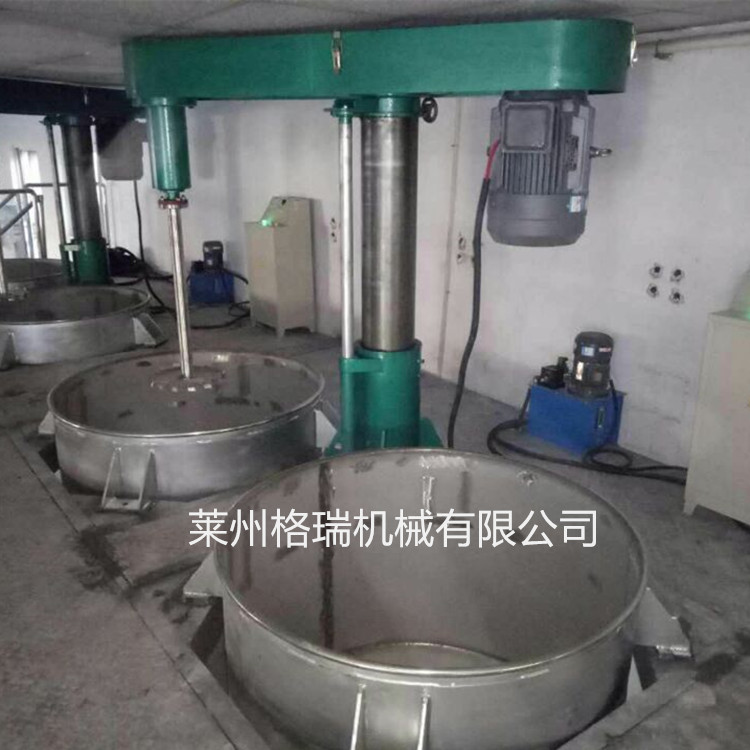 架臺(tái)式的高速分散機(jī)的主體結(jié)構(gòu),基本上和標(biāo)準(zhǔn)高速分散機(jī)的架構(gòu)相同,是配合攪拌桶的尺寸高度,將標(biāo)準(zhǔn)高速分散機(jī)固定位置于攪拌機(jī)的半腰上,可將固定在架臺(tái)上,方便由架臺(tái)上面放置原料入攪拌槽,由伸到架臺(tái)下面的攪拌桶出料口將攪拌好的原料成品排放出攪拌桶,直接包裝或者下一個(gè)程序。